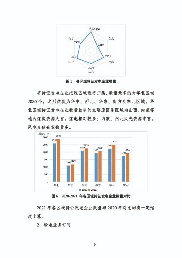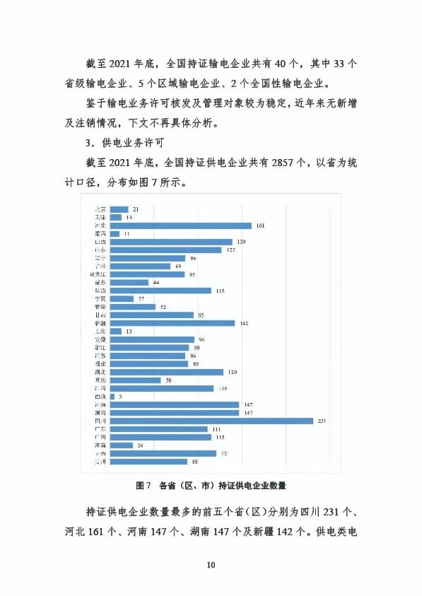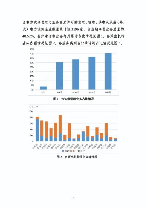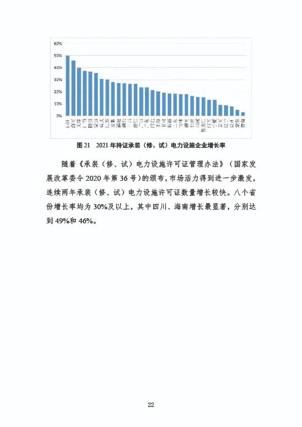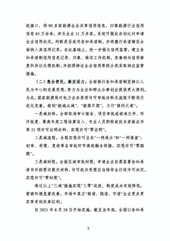 创新许可模式,深化“放管服”改革,电力业务资质许可告知承诺制实施效果明显。2021 年国家能源局全面推行电力业务资质许可告知承诺制,以“三减”措施实现“三零”成效,制度成本有效降低,营商环境明显改善。从 2021 年 8 月 26 日至2021 年底,全国以告知承诺制方式办理电力业务资质许可的发电、输电、供电及承装(修、试)电力设施企业数量累计达3196家,占当期办理业务总量的41%。