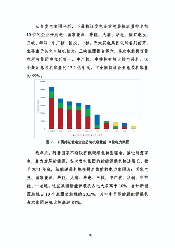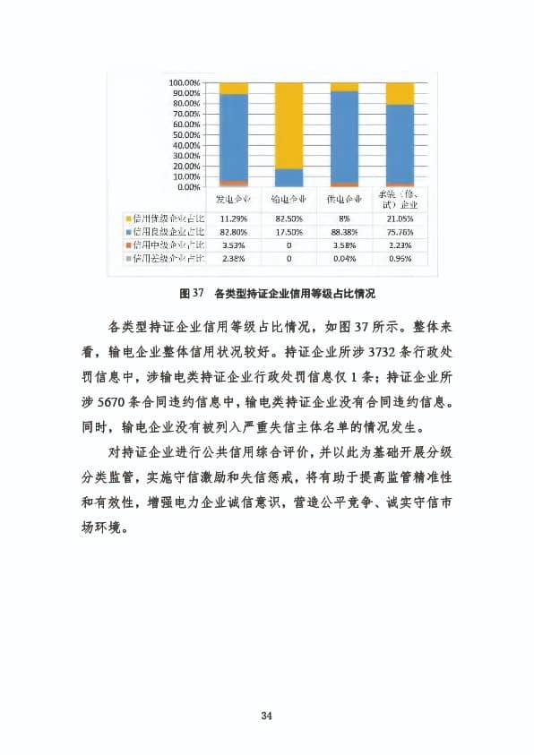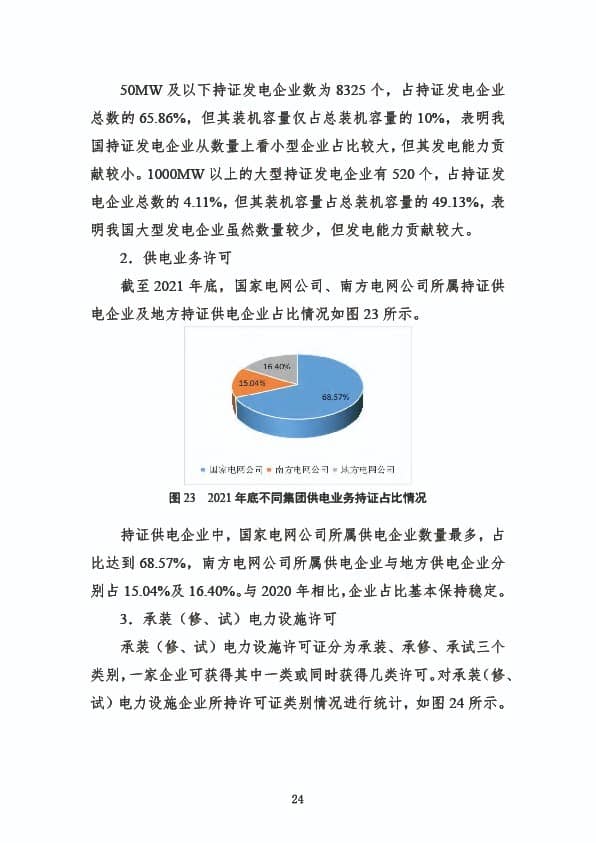 市场主体结构与规模变化各具特色,新能源成为发电装机增长的主力,承装(修、试)电力设施企业综合能力稳步提升。持证发电企业总装机容量为2067237MW。持证可再生能源企业装机占比快速提高,新增持证风电、太阳能装机容量 74803MW,已超过火电新增装机容量(57023MW),占持证企业全年新增总装机容量的近 50%,许可管理有效促进发电行业持续转型升级。从承装(修、试)电力设施企业许可等级分布看,四级企业占比最大,达60%。承装、承修、承试 3 个许可类别间的业务关联性较强,同时持有3 个类别许可的企业占比达到86%,占比进一步提高。
