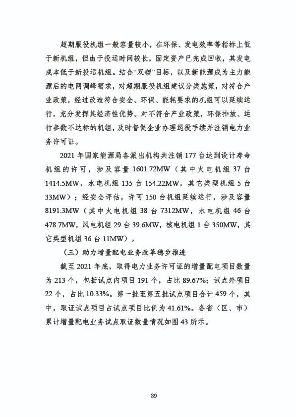 增量配电业务许可工作稳步推进,超期服役机组许可管理工作持续加强。2021 年,新增持证增量配电项目36 个,全部为试点项目。截至 2021 年底,增量配电业务累计取证数量为 213 个。第一批至第五批增量配电试点项目合计459 个,取证试点项目占比达 42%。2021 年,各派出机构对超期服役机组分类施策,符合产业政策、环保、能耗要求的机组,经安全评估后,准予延续运行,充分发挥其经济性优势;不符合产业政策,环保排放、运行参数不达标的机组及时注销许可证。2021 年,各派出机构共许可8191MW 机组延续运行,注销1602MW 达到设计寿命机组许可证。
